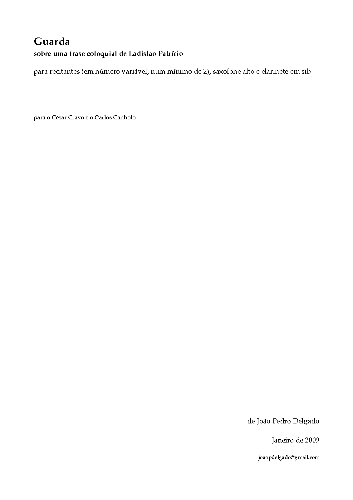 | Work Title | Guarda, para recitantes, saxofone alto e clarinete |
