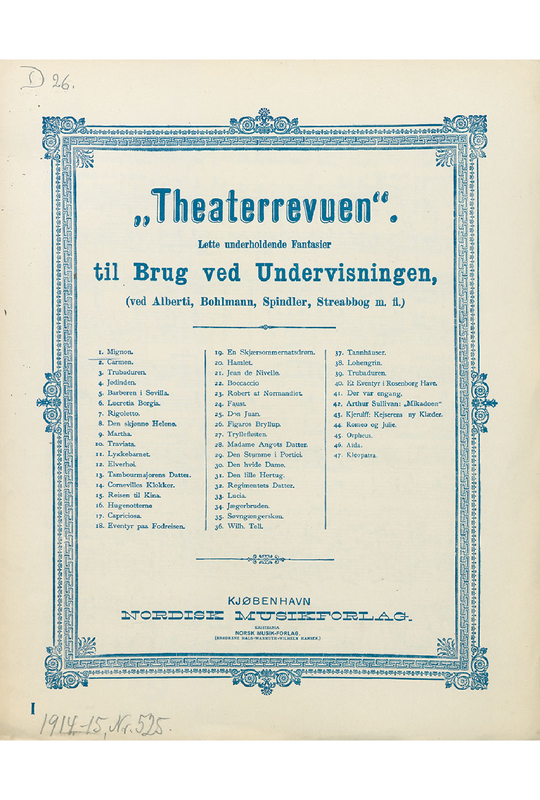 40 more: 2. Carmen: March of the Toreadors (Bizet) • 3. Il trovatore: Miserere (Verdi) • 4. Fantasie on 'La Juive' (Halévy) • 5. Fantasie on 'Il barbiere di Siviglia' (Rossini) • 6. Fantaisie on 'Lucrezia Borgia' (Donizetti) • 8. La belle Hélène, Petite fantaisie (Offenbach) • 9. Souvenir de Martha (Flotow) • 10.Fantaisie on La Traviata (Verdi) • 11. La mascotte: Divertissement (Audran) • 12. Elverhøj: Arrangement (Kuhlau) • 13. La fille du tambour-major: Fantaisie (Offenbach) • 14. Les cloches de Corneville: Fantaisie (Planquette) • 15. Reisen til China: Arrangement (Unknown) • 16. Les Huguenots. Fantaisie (Meyerbeer) • 17. Capriciosa (Unknown) • 18. Fra Vaudevillen Eventyr paa Fodreisen (Various composers) • 19. A Midsummer Night's Dream: Fantasy (Mendelssohn) • 20. Hamlet: Fantaisie (Thomas) • 22. Boccaccio: Paraphrase (Suppé) • 23. Robert le diable: Fantaisie (Meyerbeer) • 24. Faust: Themes (Gounod) • 25. Don Giovanni Fantasy (Mozart) • 26. Arrangement of Le nozze di Figaro (Mozart) • 27. Zauberflöte-Potpourri (Mozart) • 28. Fantaisie sur La fille de Madame Angot (Lecocq) • 29. Fantaisie sur La muette de Portici (Auber) • 30. Airs de La dame blanche (Boieldieu) • 31. Fantaisie sur Le petit duc (Lecocq) • 32. Souvenir de La fille du régiment (Donizetti) • 33. Paraphrase of Lucia di Lammermoor (Donizetti) • 34. Der Freischütz, Bearbeitung (Weber) • 35. Airs from La sonnambula (Bellini) • 36. Fantasy on Guillaume Tell (Rossini) • 37. Tannhäuser-Bearbeitung (Wagner) • 38. Lohengrin-Fantasie (Wagner) • 39. Arrangement of Il trovatore (Verdi) • 40. Fra Et Eventyr i Rosenborg Have (Weyse) • 41. Fra Der var engang (Lange-Müller) • 42. The Mikado (Sullivan) • 43. Fra Kejserens nye Klæder (Kjerulf)