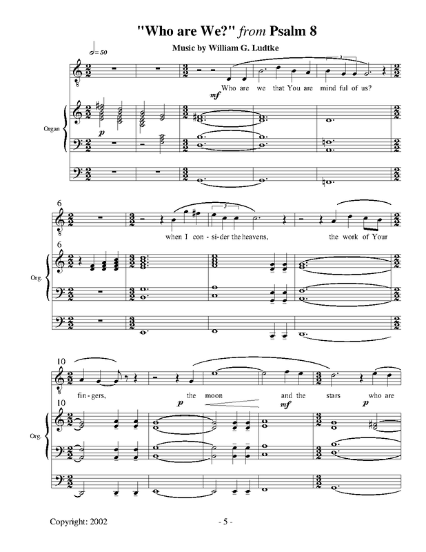 "Who are We?" from Psalm 8 is a piece for high voice and organ composed by William G. Ludtke, organist for the historic First Church of Christ, Scientist in Berkeley, California.