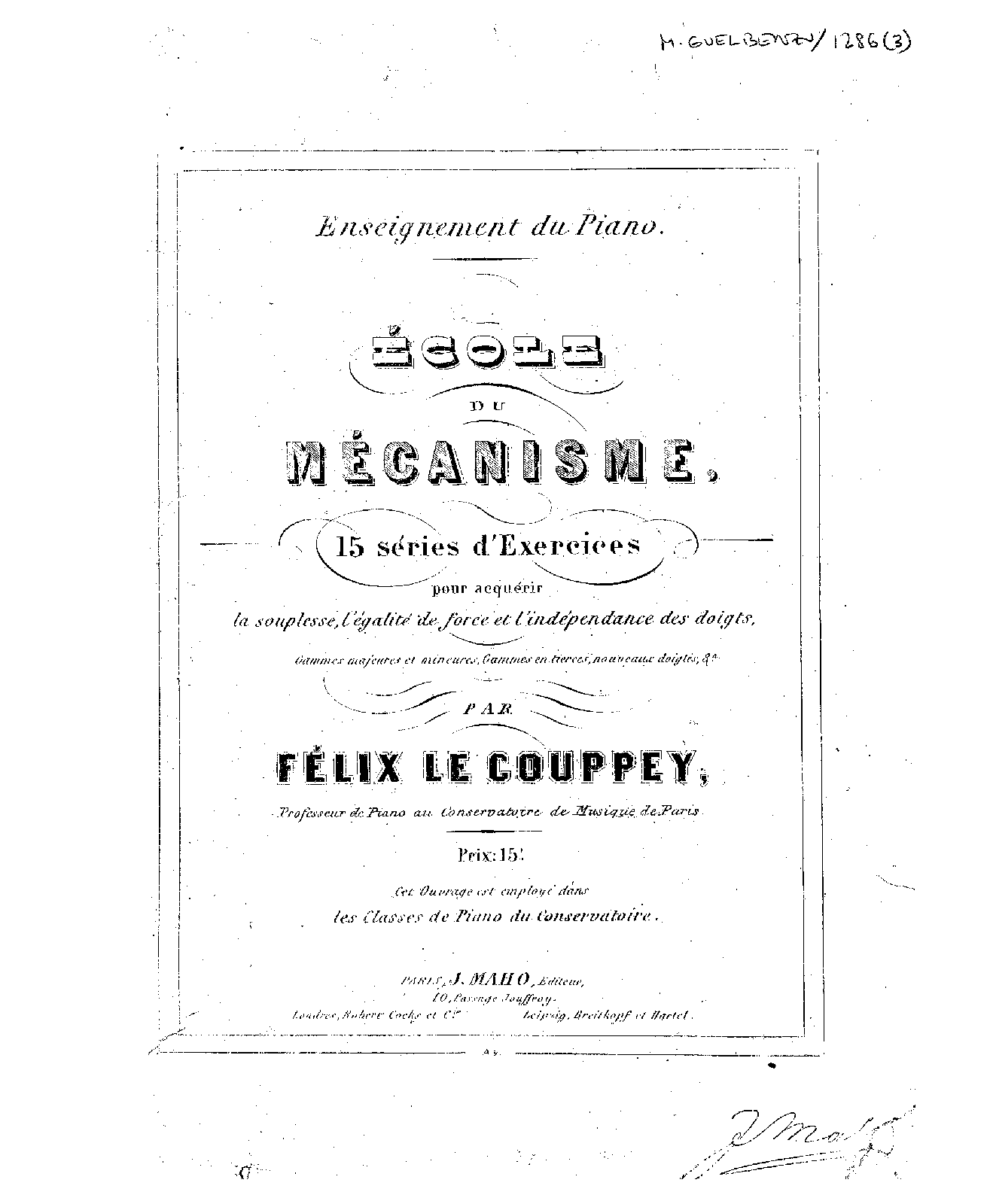 | Alternative. Title | 15 séries d'exercices pour acquérir la souplesse, l'égalité de force et l'indépendance des doigts, gammes majeures et mineures, gammes en tierces, nouveaux doigtés |