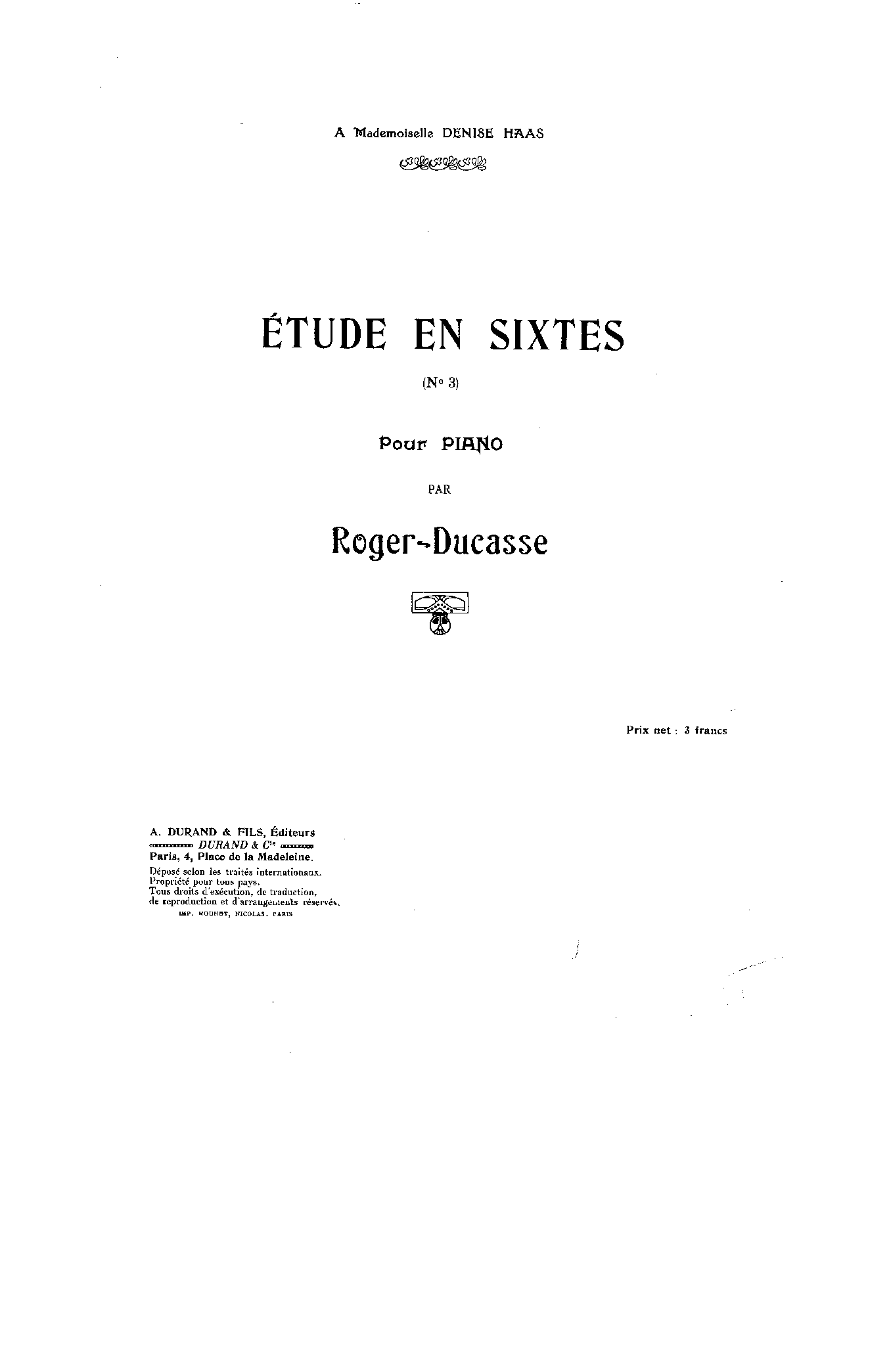 | Extra Information | The first edition labeled this etude as "No.3", possibly in reference to the piece as the 3rd etude by Roger-Ducasse to be published by Durand around the same time, the others being Étude in G-sharp minor and Étude in A-flat major. |