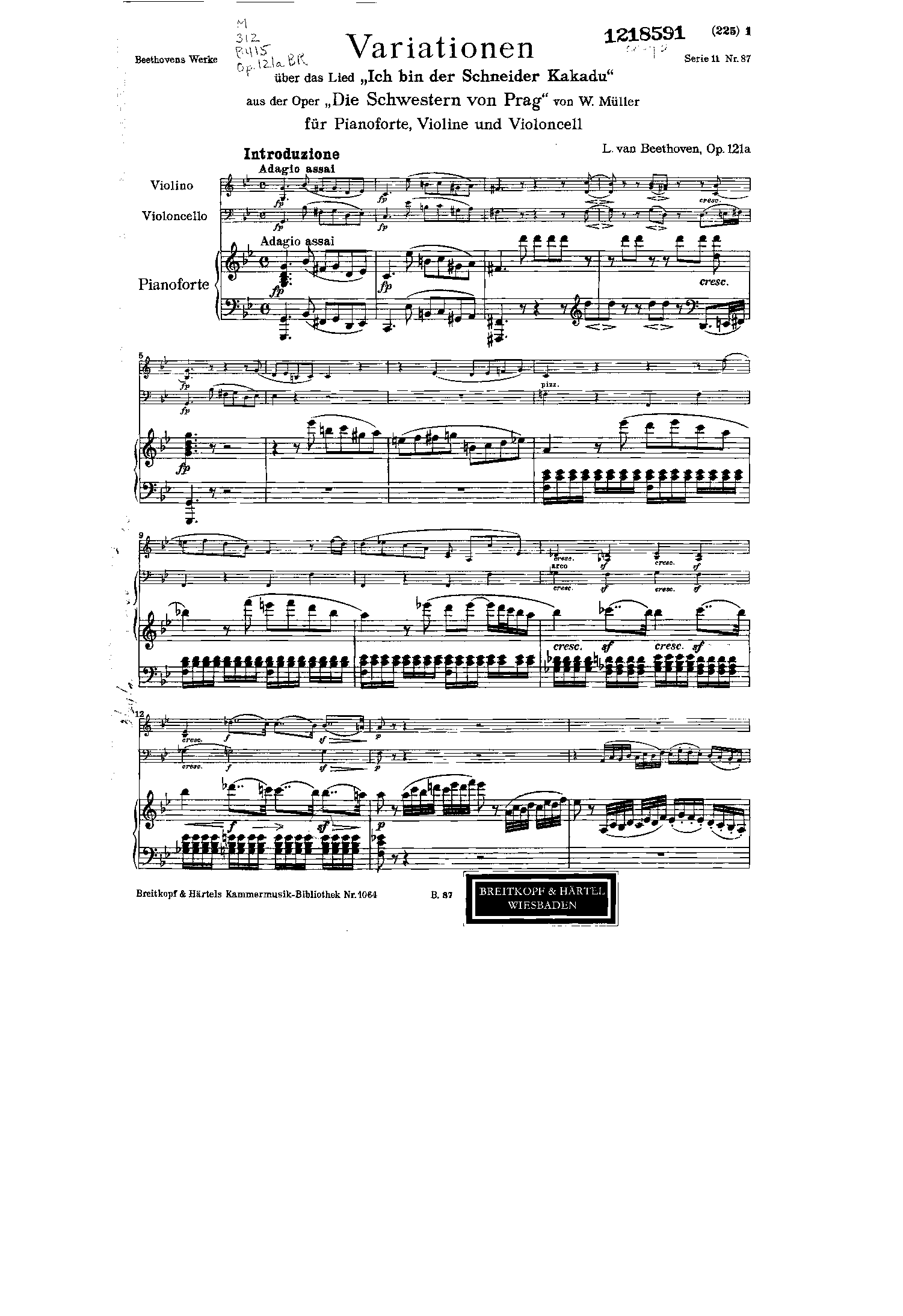 | Name Aliases | Variationen über „Ich bin der Schneider Kakadu“; Variationen g-Moll/G-Dur op. 121a; Variaciones Kakadu en sol mayor, Op. 121a; Diez variaciones sobre el tema "Ich bin der Schneider Kakadu", Op.121a; Trío para piano n.º 11 en sol mayor |