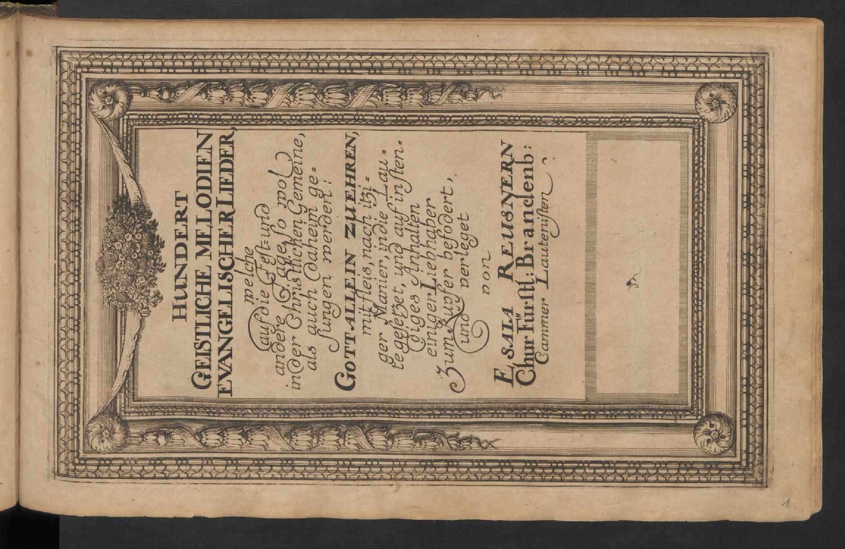 | Alternative. Title | Hundert Geistliche Melodien Evangelischer Lieder welche auf die Fest- und andere Tage, so wol in der Christlichen Gemeine, als auch daheim gesungen werden: Gott allein zu ehren, mit fleis, nach itziger Manier, in die Laute gesetzet, und auf instendiges Anhalten einiger Liebhaber zum Kupfer befodert, und verleget von Esaia Reusnern |