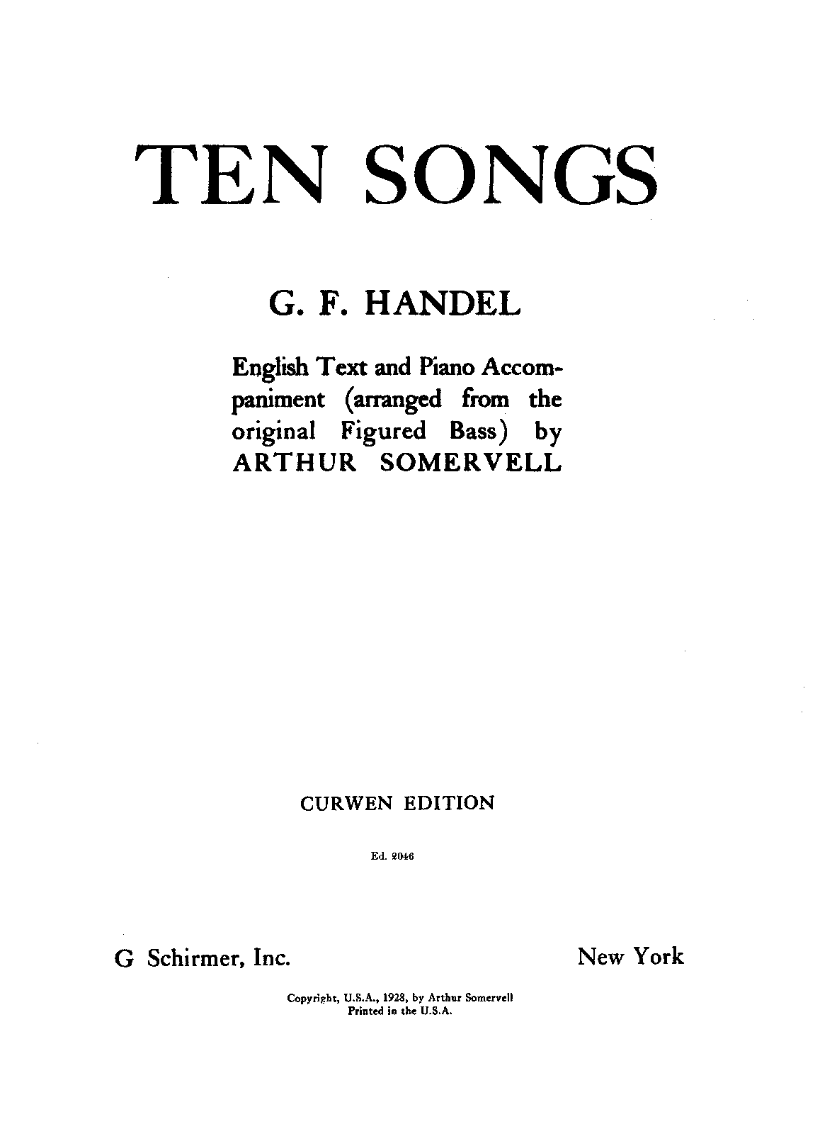 10 Songs. English Text and Piano Accompaniment (Arranged From the Figured Bass) by Arthur Somervell.