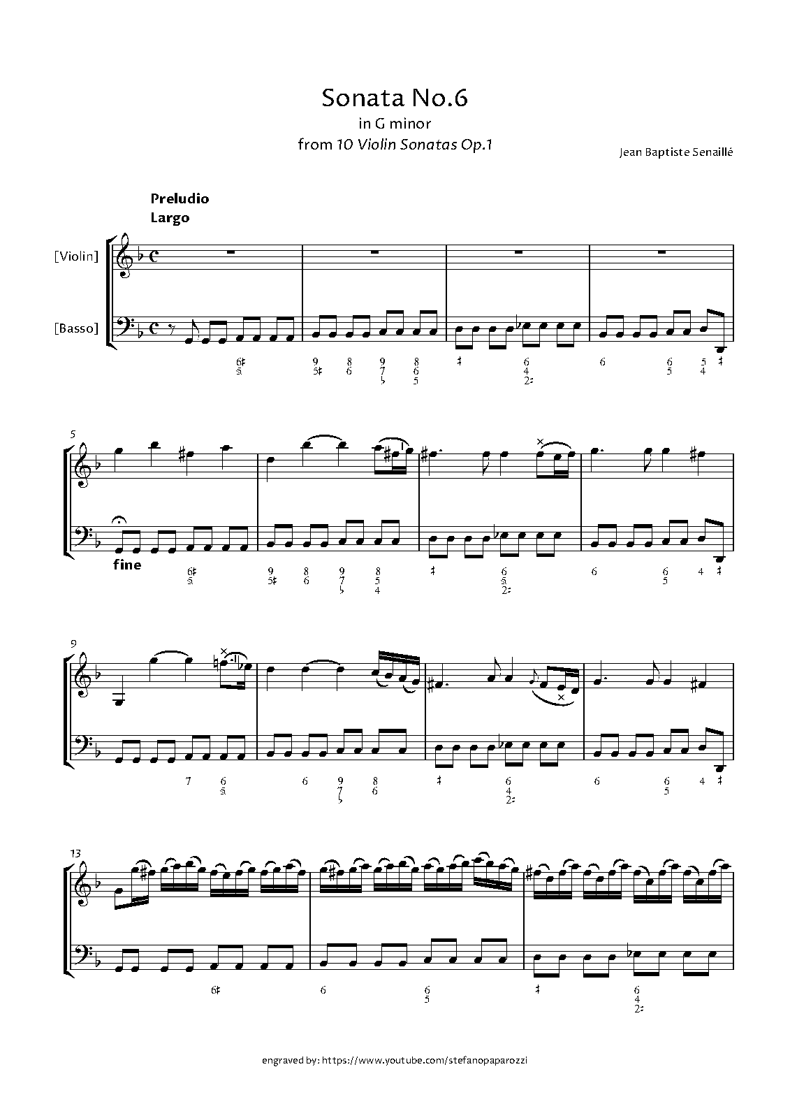 This is not a scientific critical edition, it's just an engraving made for study purpose. The main source used is the score available on IMSLP (1710). The souce is perfectly readable and generally very coherent, so that no relevant adjustment has been made. The small vertical dash appearing with some slurs (obiquitous in every Sonatas) has been retained, but currently this symbol – most likely some form of ornament – hasn't any valid explanation. For clarity, the original Violin part notated in French treble clef has been transposed in modern treble clef.