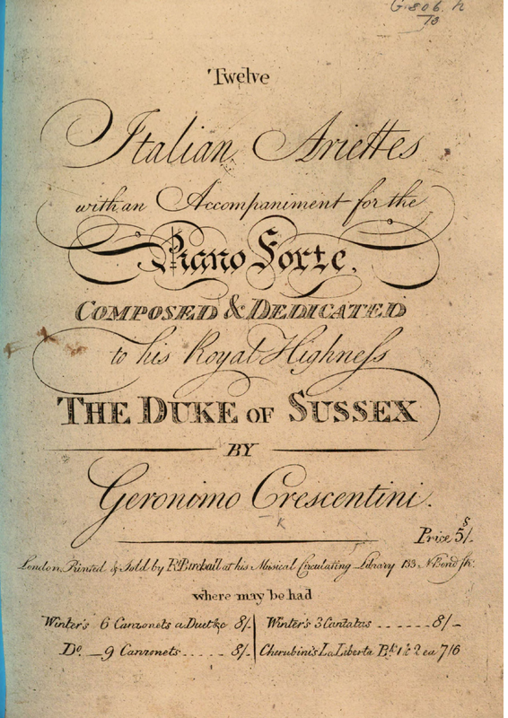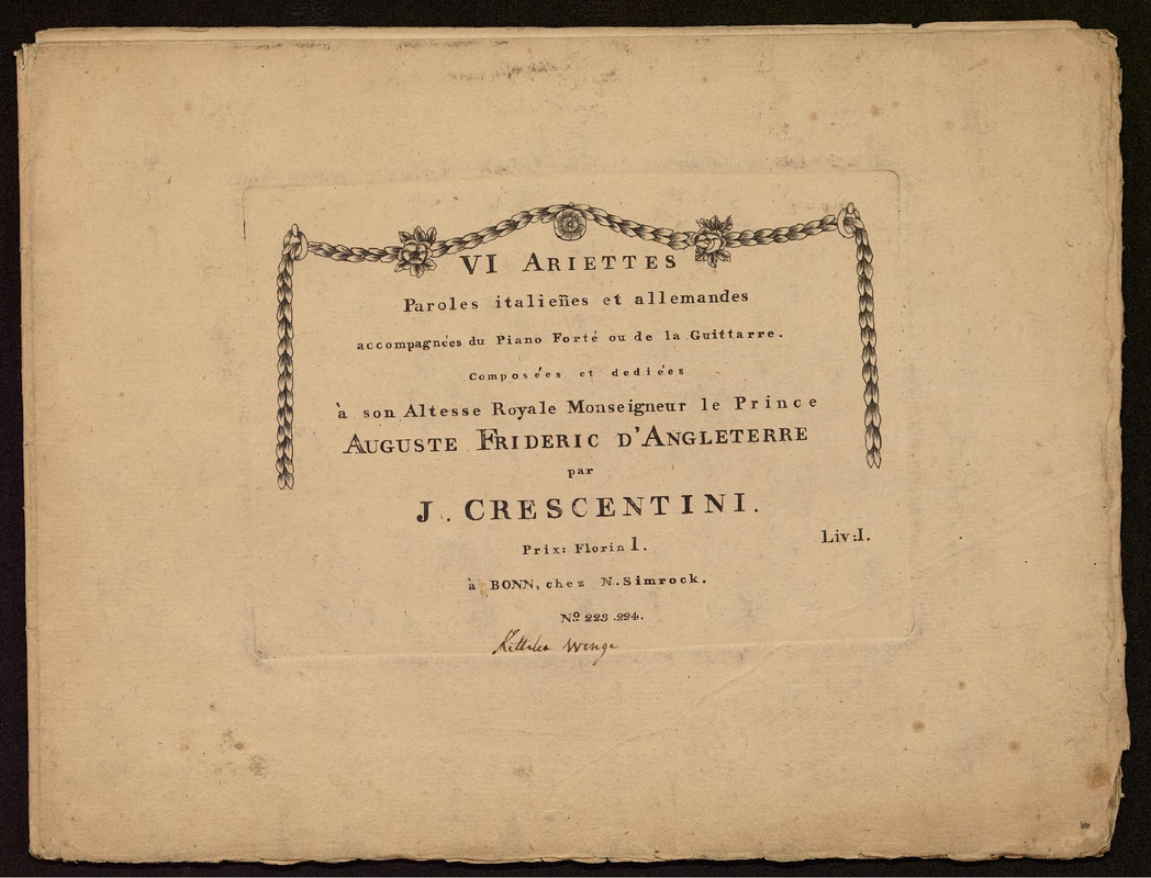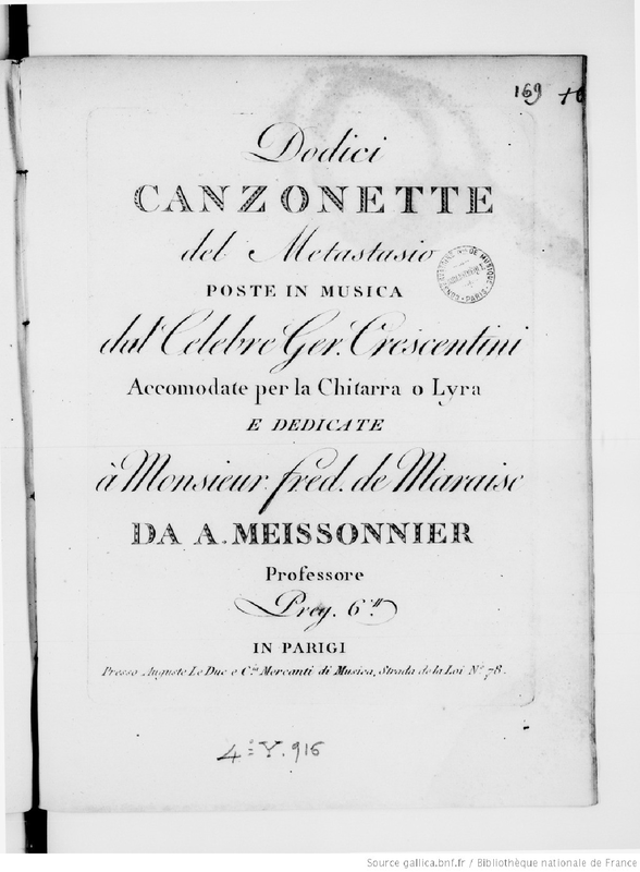 Dodici canzoni o sianno ariette a solo per vocce [sic] contralto o soprano secondo con a[c]compagnamento di piano composizzione [sic] del signore Girolamo Crescentini