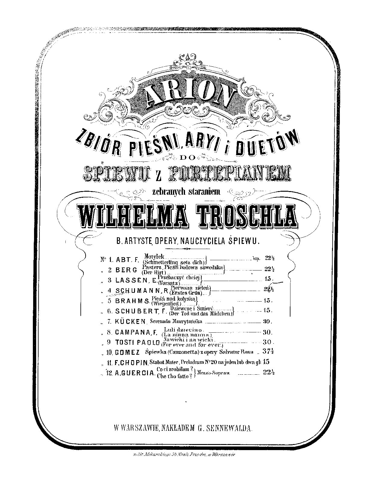 Arion: Zbiór pieśni, arii i duetów, No.4 Warsaw: G. Sennewald, n.d.(ca.1875).