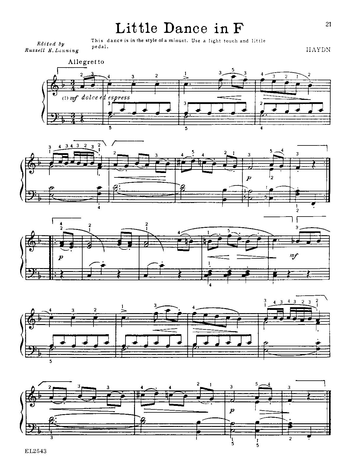 21 Minuets, Hob.IX:21 Minuet in G major, Hob.IX:23 Minuet in F major, Hob.IX:25 Minuet in F-sharp major, Hob.IX:26 Minuet in C major, Hob.IX:27 (Ox minuet) 8 Gypsy Dances, Hob.IX:28 5 Contra Dances and a Quadrille, Hob.IX:29 English Dance in F major, Hob.IX:30 |