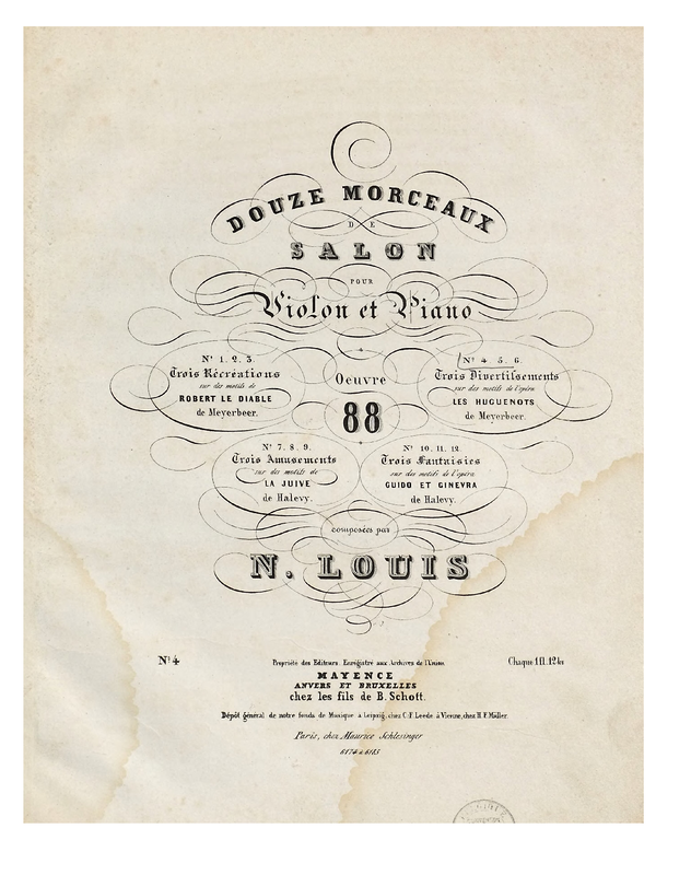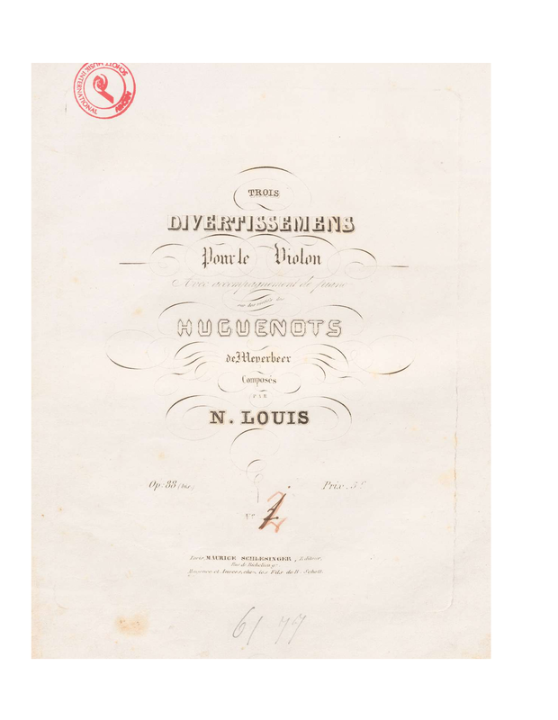 | Extra Information | Monatsbericht (1841), p.66 Also published for violin and piano Divertissement facile sur les Huguenots p. Pfte et Violoncelle. Mainz. Schott Monatsbericht (1857), p.52 |