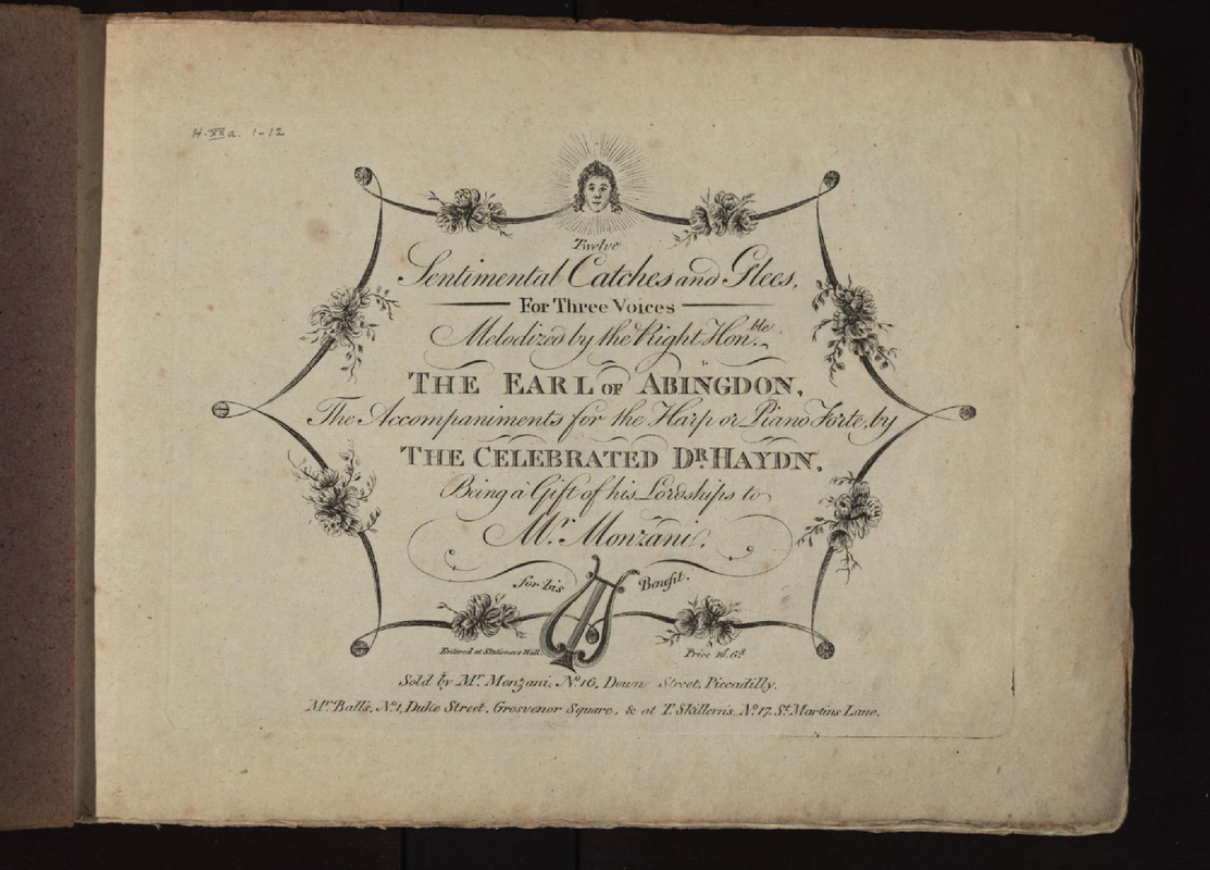 Twelve Sentimental Catches and Glees, for three voices. Melodized by the Right Honble. The Earl of Abingdon, the accompaniments for the Harp of Piano Forte, by the celebrated Dr. Haydn, being a gift of his lordship's to Mr. Monzani, for his benefit