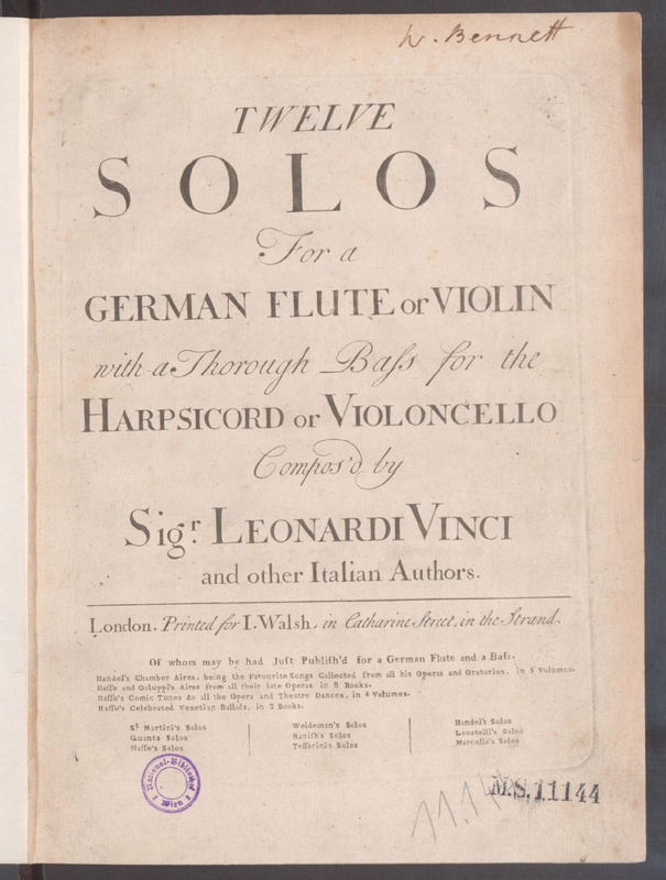 Twelve Solos for a German Flute or Violin with a Thorough Bass for the Harpsichord or Violoncello compos'd by Sigr. Leonardi Vinci and other Italian Authors