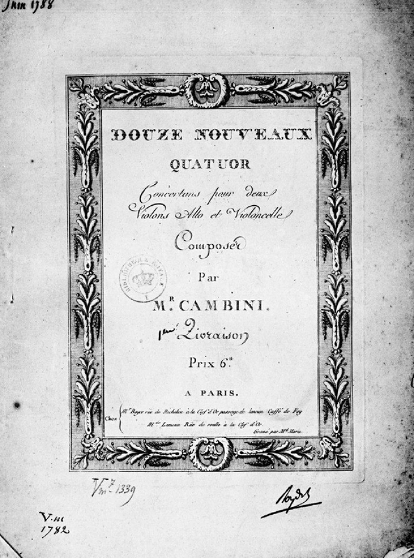 | Alternative. Title | Douze Noveaux Quatuors Concertans pour deux Violons, Alto et Violoncelle Compose par Mr Cambini |