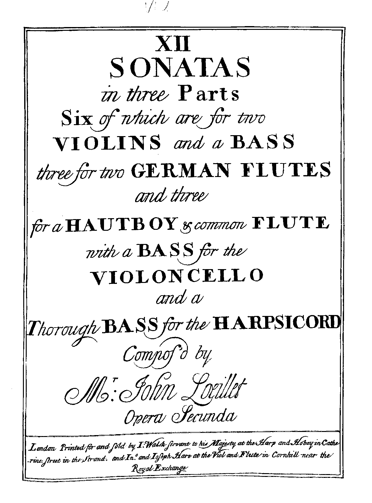 | Alternative. Title | XII Sonatas in Three Parts Six of Which are for Two Violins and a Bass Three for Two German Flutes and Three for a Hautboy & Common Flute with a Bass for the Violoncello and a Thorough Bass for the Harpsicord |