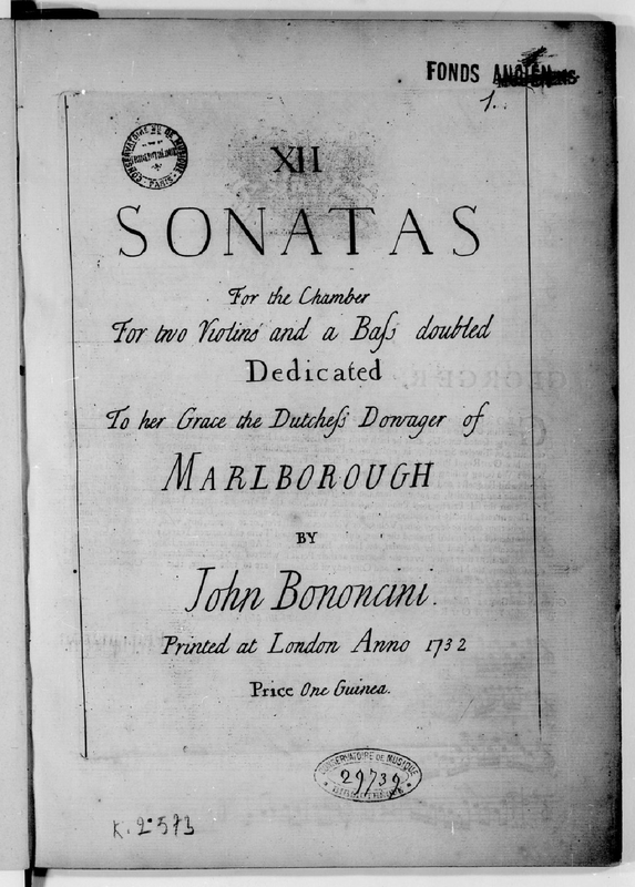 | Alternative. Title | XII Sonatas For the Chamber For two Violins and a Bass doubled |