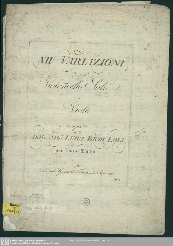 | Alternative. Title | XII Variazioni per il Violoncello Solo e Viola composte dal Sigr. Luigi Bichi Loli, per Uso d'Hmilton [sic] |