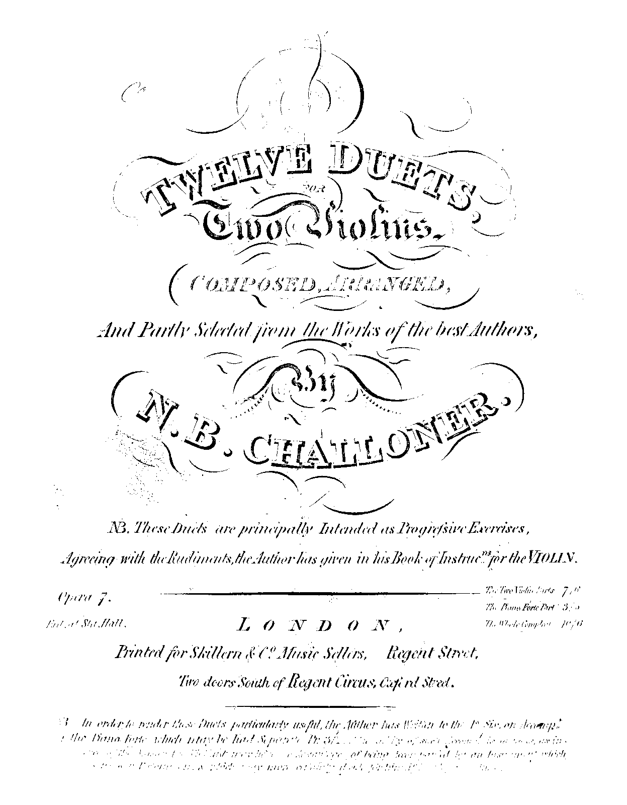 | Alternative. Title | Twelve duets for two violins, opera 7 composed, arranged, and partly selected from the works of the best authors, by N.B. Challoner |