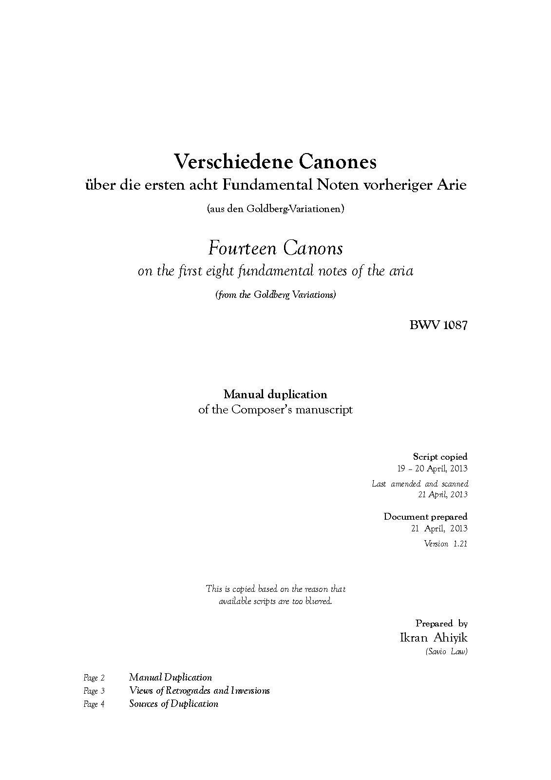 Alternative. Title Verschiedene Canones über die ersten acht Fundamental Noten vorheriger Arie