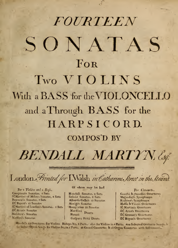 | Alternative. Title | Fourteen Sonatas for Two Violins with a Bass for the Violoncello and a Through Bass for the Harpsicord, compos'd by Bendall Martyn, Esq. |
