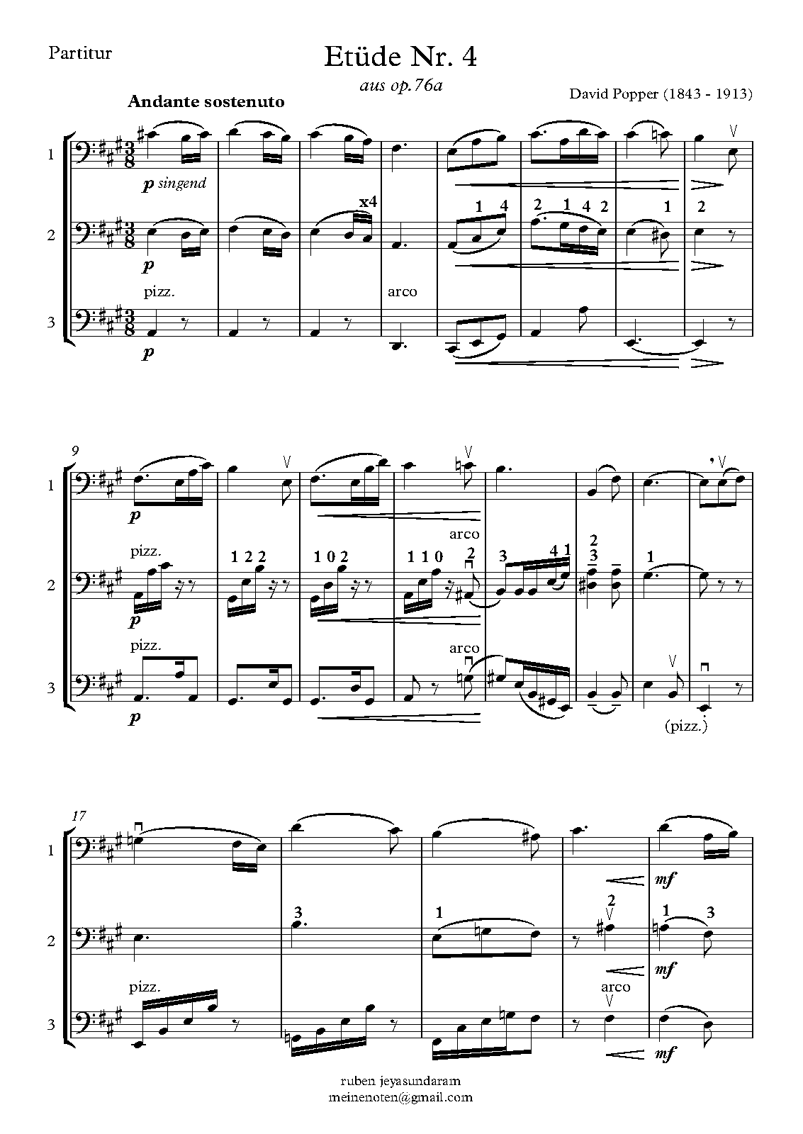 Complete title as originally published without opus designation: 15 leichte, melodisch-harmonische und rhythmische Etüden für Violoncell : (durchwegs in der I. Lage) mit Begleitung eines II. Violoncells (ad libitum) als Vorstufe zu den "Zehn mittelschweren Etüden" op. 76 und den "Vierzig grossen Etüden der Hohen Schule des Violoncellspiels" op. 73