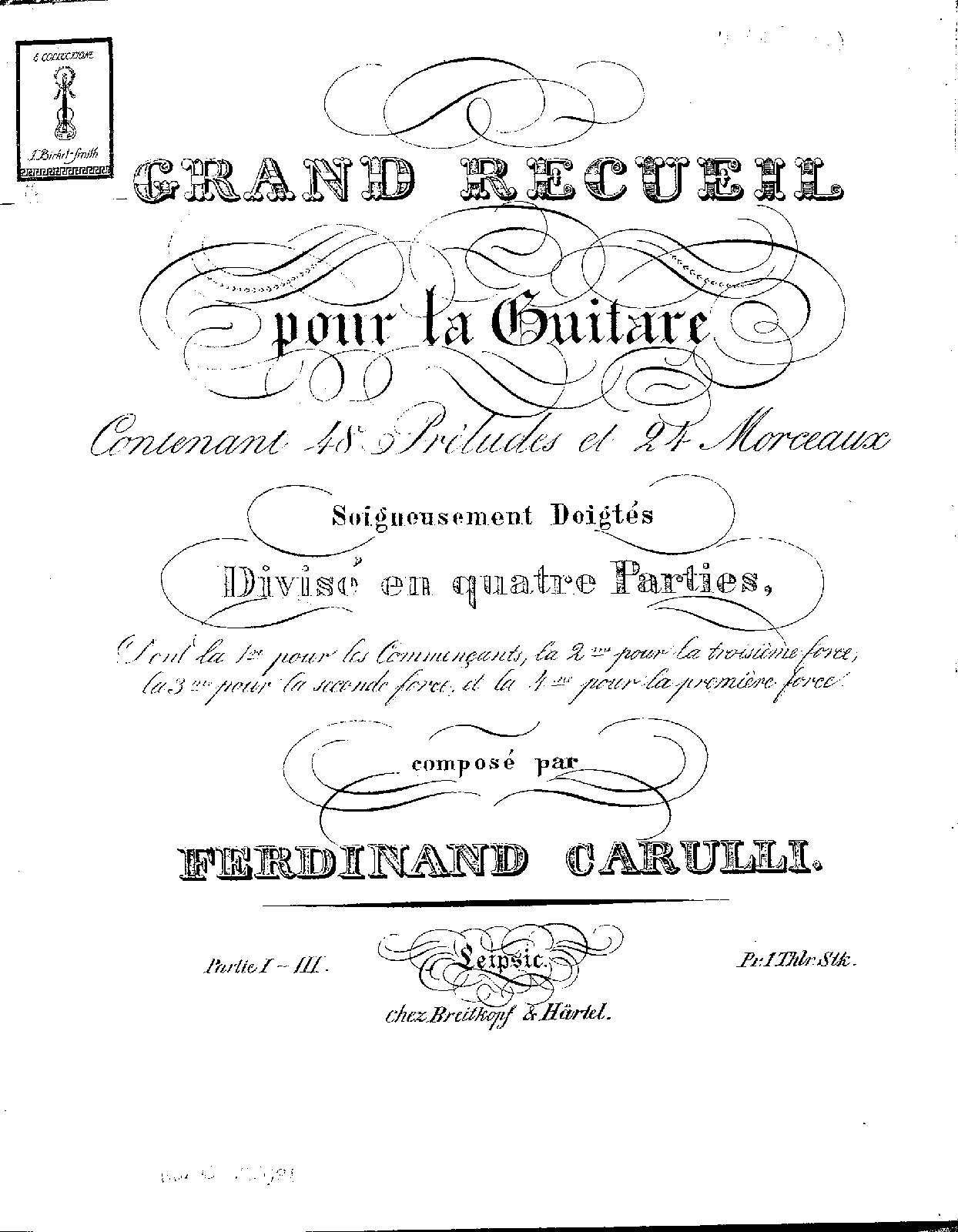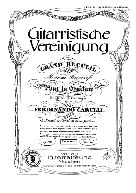 Ce recueil est divisé en deux parties. La première contient dix-huit morceaux pour les commençants qui n'ont reçu que peu de leçons, et la difficulté de ces morceaux augmente progressivement jusqu'à la 3e force. La seconde partie contient douze Romances favorites de A. Romagnesi arrangées pour une ou deux Guitares.