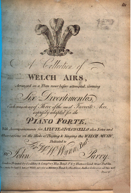Alternative. Title A Collection of Welch Airs, Arranged on a Plan never before attempted, forming Six Divertimentos, Each consisting of Three of the most Favorite Airs, expressly adapted for the Piano Forte, With Accompaniments for A Flute & Violoncello also Notes and Observations on the Mode of Playing & Singing the Welch Music