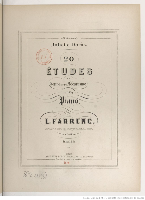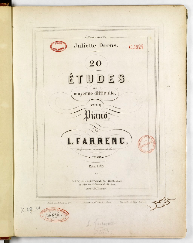 Bibliothèque nationale de France, Conservatoire (F-Pn): Conservatoire, X-682 (1) . Copublished by Hofmeister? also Publication noted in the Bibliographie de la France 1e série, 45e année (59e de la collection), Nº 2, 12 Janvier 1856, p.53, r.124. - 1855 however (see datestamp or: BNF). Plate "A.F." suggests engraving by her husband's firm A. Farrenc.
