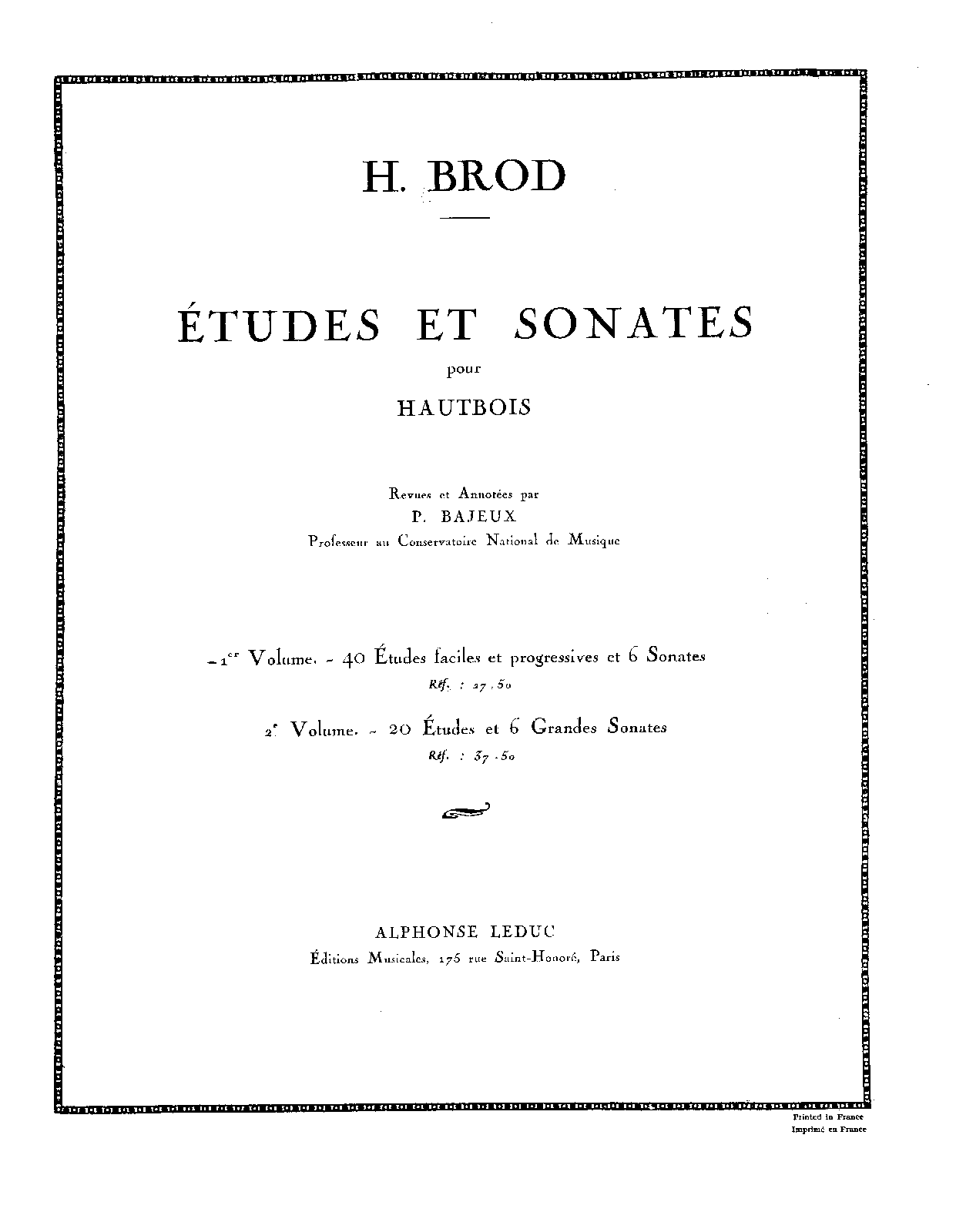 Originally published in two volumes, Brod's Méthode de hautbois was likely issued between 1830-1835. The present volume represents the first of two. Aside from some basic, introductory prose and scale exercises, this volume is notable for the "40 Leçons faciles et progressives" and the "6 sonates faciles ". Here, they are printed with optional bass accompaniment, but later were reprinted as edited (i.e., Bajeux) with only the treble line. The Études et Sonates edited by Pierre Bajeux contain both volumes of the method with prose and rudimentary scale exercises redacted. Thus, volume one contains the two major sections from the above méthode.
