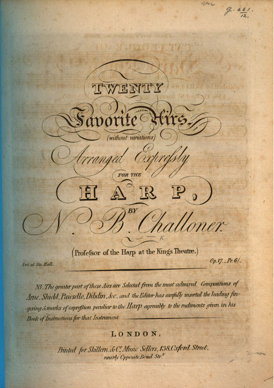 | Extra Information | NB. The greater part of these Airs are Selected from the most admired Compositions of Arne, Shield, Paiesello [sic], Dibdin, &c. and the Editor has carefully inserted the leading fingering & marks of expression peculiar to the Harp agreeably to the rudiments given in his Book of Instructions for that Instrument. |