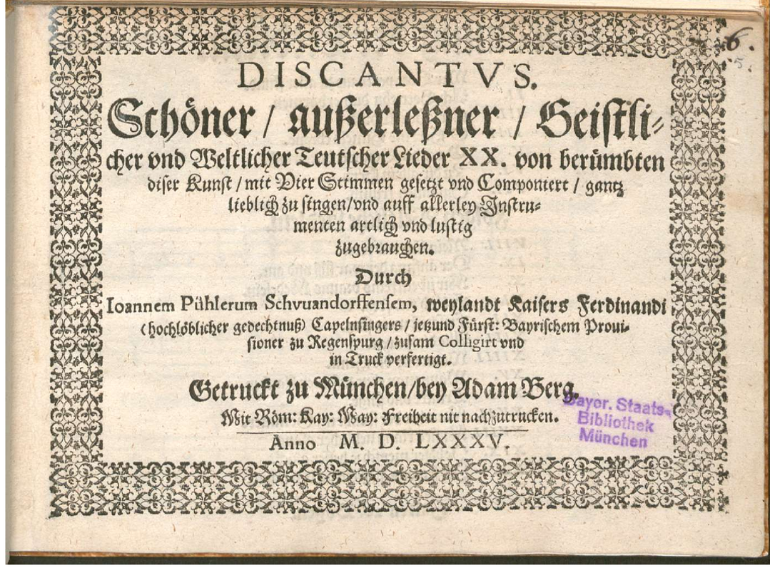 Schoener, auszerleszner, Geistliche und Weltliche Teutsche Lieder XX. von beruembten diser Kunst, mit Vier Stimmen gesetzt und Componiert, gantz lieblich zu singen, und auff allerley Instrumenten artlich und lustig zugebrauchen. Durch Ioannem Pühlerum Schvuandorffensem ... zusam colligirt und in Truck verfertigt