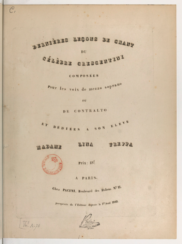 | Alternative. Title | Dernières Leçons de chant du celebre Crescentini composees pour les voix de mezzo soprano ou de contralto |