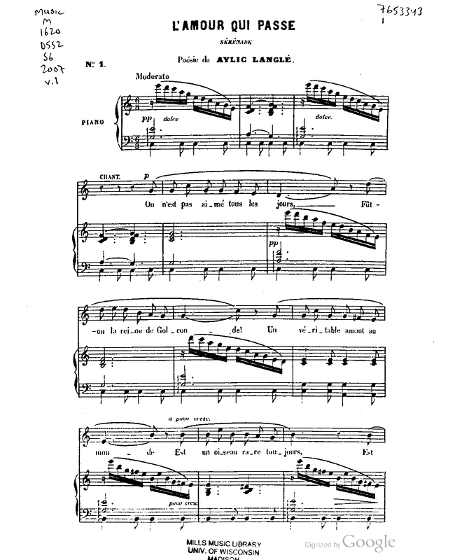 ⇒ 12 more: 2. Adieu la Marguerite! • 3. Chanson pour Alceste • 4. La fauvette • 10. Sérénade espagnole • 13. J'ai dit à mon âme • 14. À Ninon • 15. Essor! • 16. Inquiètude • 17. Pastorale • 18. Le cavalier • 19. Mon cœur est épris d'un brûlant amour • 20. Claudinette