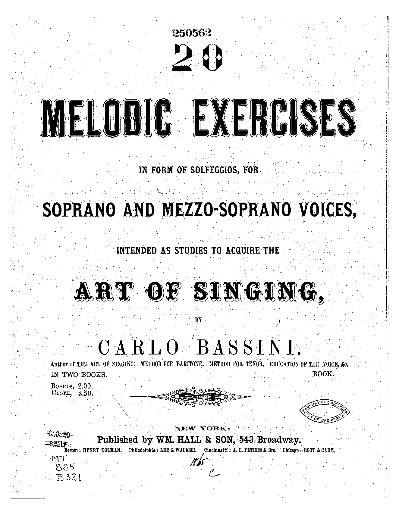 | Alternative. Title | 20 melodic exercises, in form of solfeggios, for soprano and mezzo-soprano voices, intended as studies to acquire the art of singing, by Carlo Bassini |