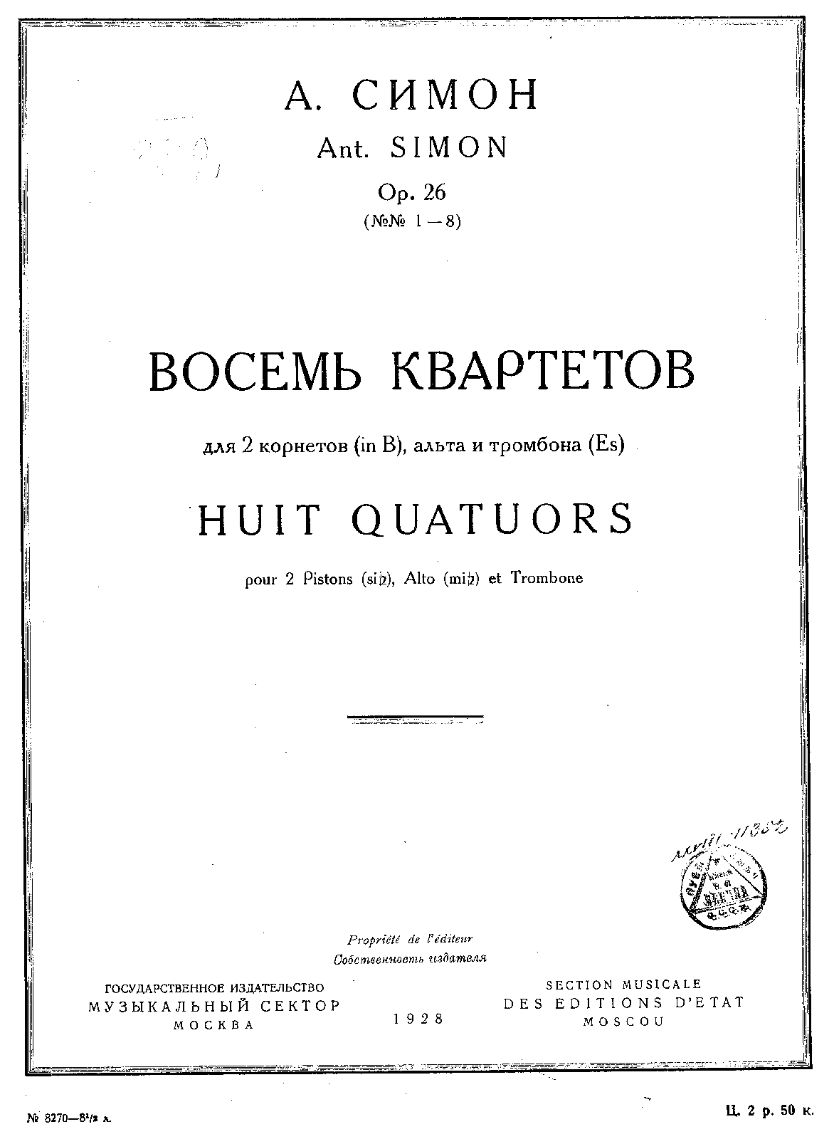 | Genre Categories | Pieces; For horn, 2 cornets, trombone; Scores featuring the horn; |