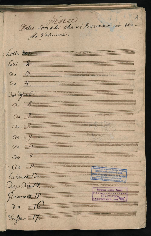 RISM. Manuscript originally in Kyiv library. The list of works is as given on the cover, but the order is not correct. To accesss each sonata, go to the SBB site using the scanned by link.