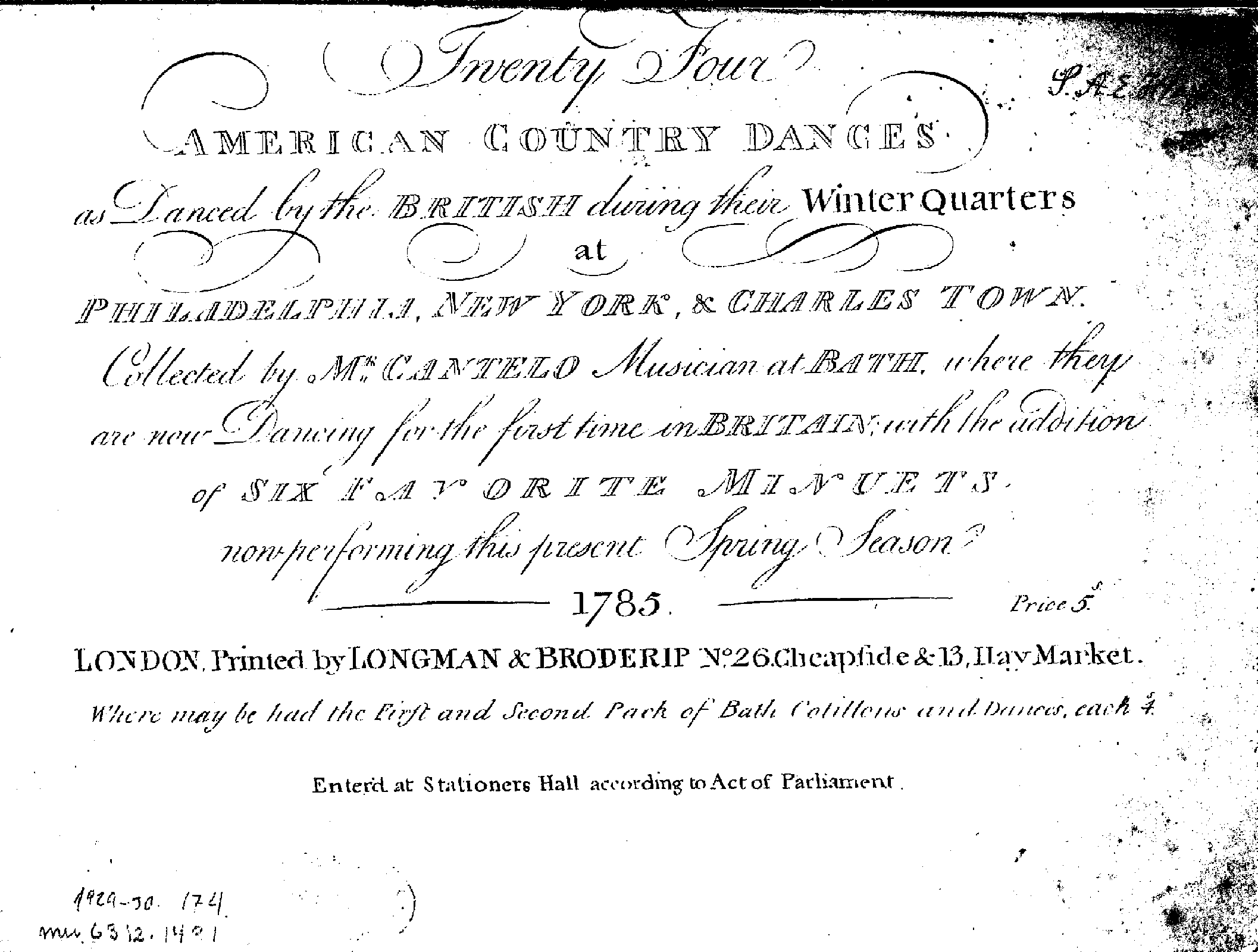 Work Title Twenty Four American Country Dances as Danced by the British during their Winter Quarters at Philadelphia, New York, & Charles Town. Collected by Mr. Cantelo Musician at Bath, where they are now Dancing for the first time in Britain, with the addition of Six Favorite Minuets now performing this present Spring Season