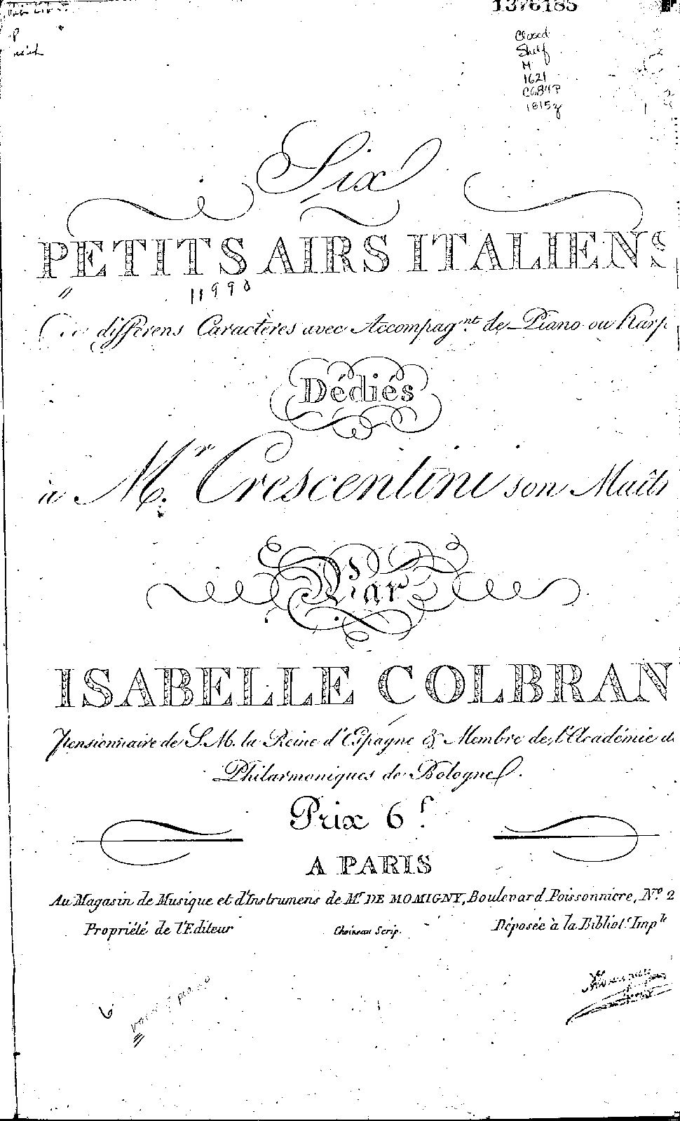 | Dedication | Première recueil: Maria Luisa of Parma (queen of Spain) Deuxième recueil: Louise of Baden (Elizabeth Alexeievna, empress of Russia) Troisième recueil: Julie Clary (queen of Spain) Quatrième recueil: Girolamo Crescentini (her teacher) |