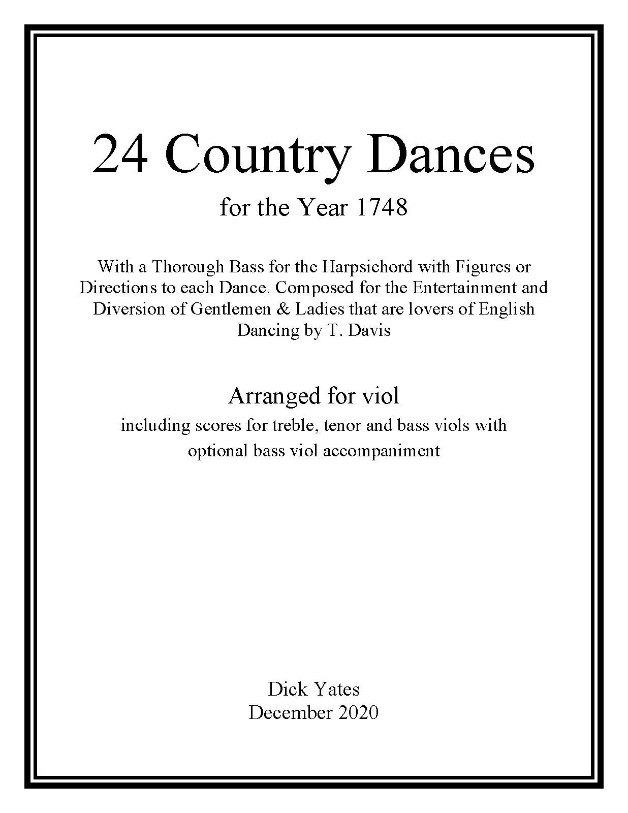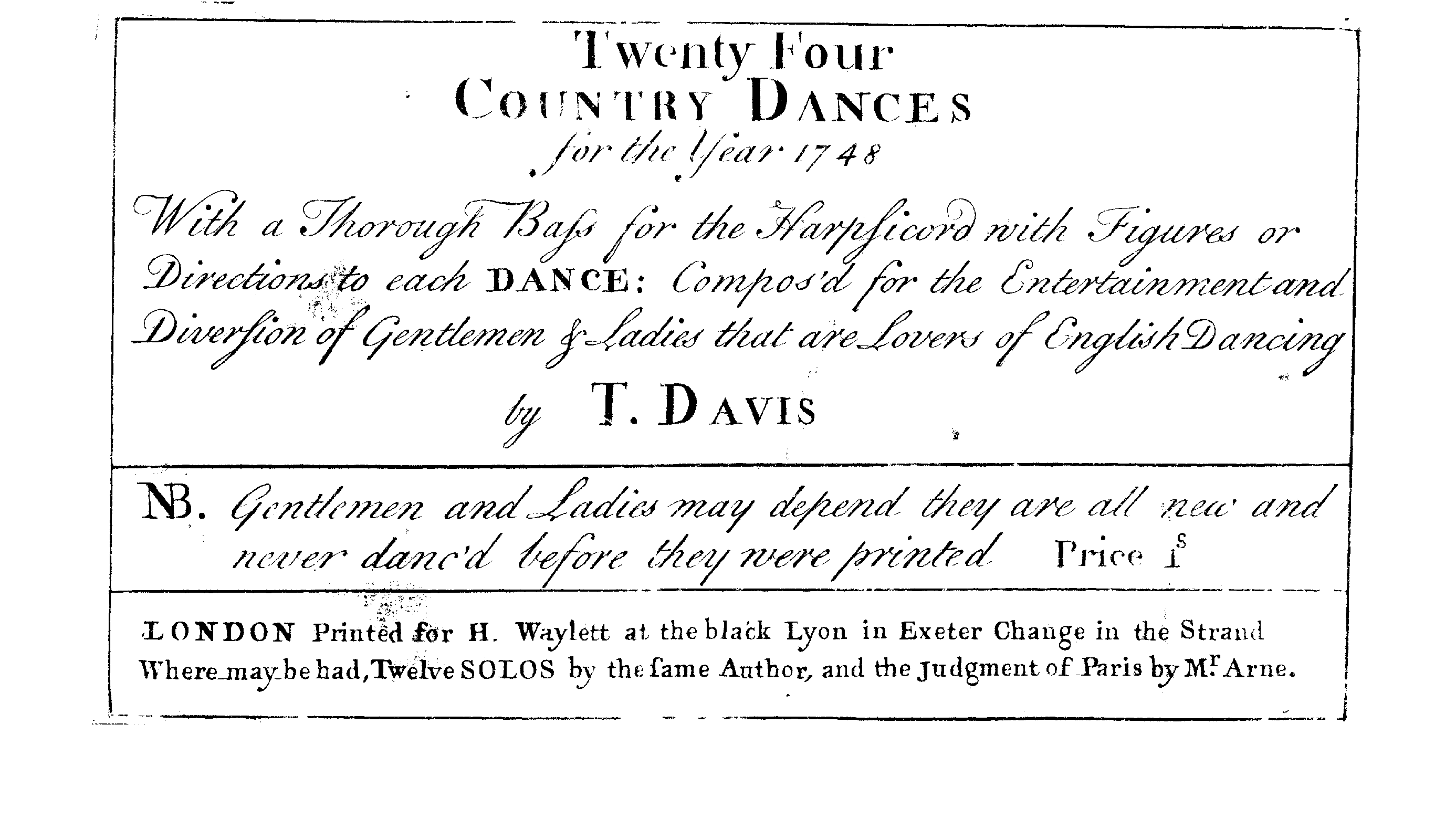 Twenty Four Country Dances for the Year 1748 With a Thorough Bass for the Harpsicord with Figures or Directions to each Dance: Compos'd for the Entertainment and Diversion of Gentlemen & Ladies that are Lovers of English Dancing by T. Davis. N.B. Gentlemen and Ladies may depend they are all new and never danc'd before they were printed.