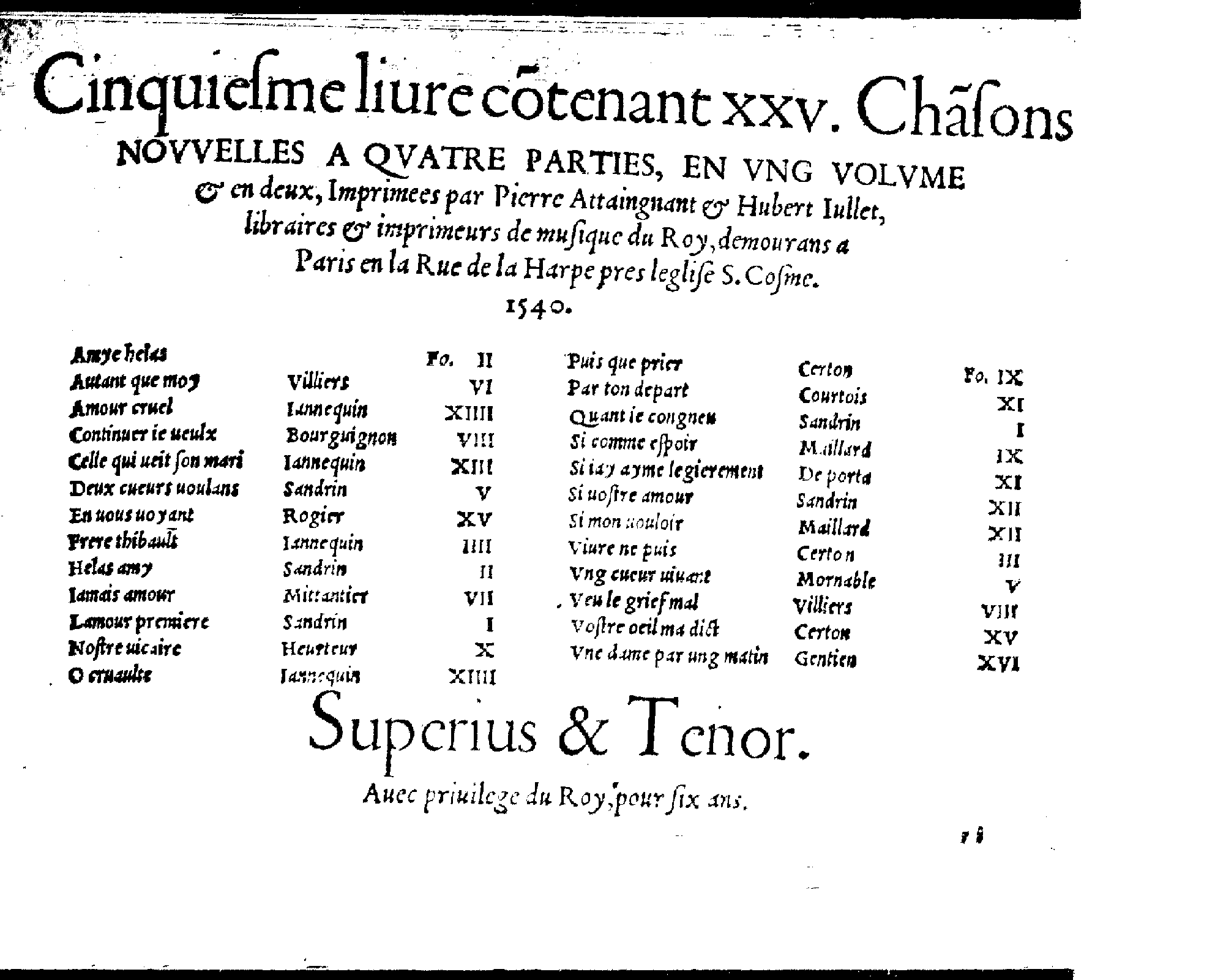 | Alternative. Title | Cinquiesme livre contenant XXV chansons nouvelles ; Cinquiesme livre cõtenant XXV. Chãsons nouvelles a quatre parties en un volume et en deux |