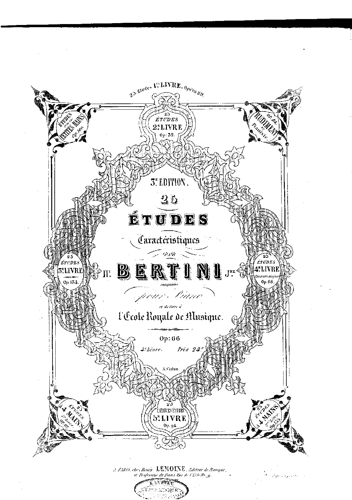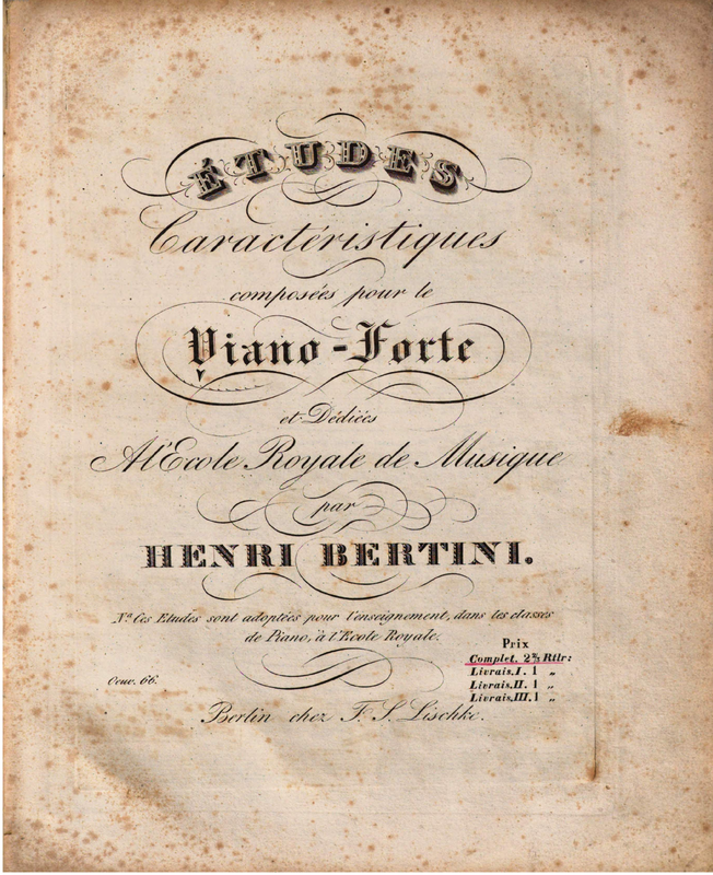 | Extra Information | Reviewed in 28 November 1832 AMZ, col.807. HMB gives 1830 for publication date (Monatsbericht (1830), p.41.) (Etudes caracteristiques by Bertini, published by Lemoine, without opus number, are mentioned in the 31 January 1829 Revue bibliographique du Royaume des Pays-bas et de l'étranger. Not sure if they are these works, however.) - Schissel |
