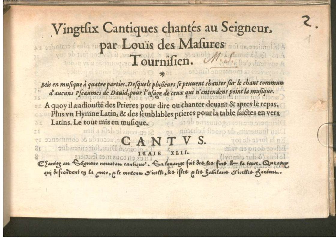 Vingtsix Cantiques chantés au Seigneur par Louis des Masures Tournisien. Mis en musique a quatre parties. Desquels plusieurs se peuvent chanter sur le chant commun d'aucuns Pseaumes de Davide, pour l'usage de ceux qui n'entendent point la musique.