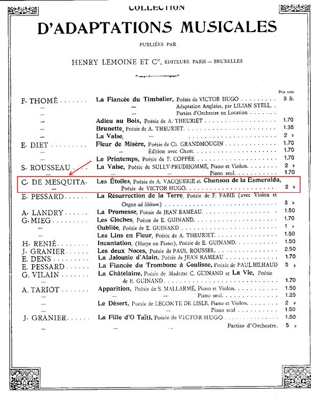 Deux Adaptations Musicales par Carlos de Mesquita (1864-1953) - 1. Les Étoiles; Poésie de Auguste Vacquerie(1819-1895); 2. Chanson de La Esmeralda: Poésie de Victor Hugo. For spoken voice and piano with superlinear French words.