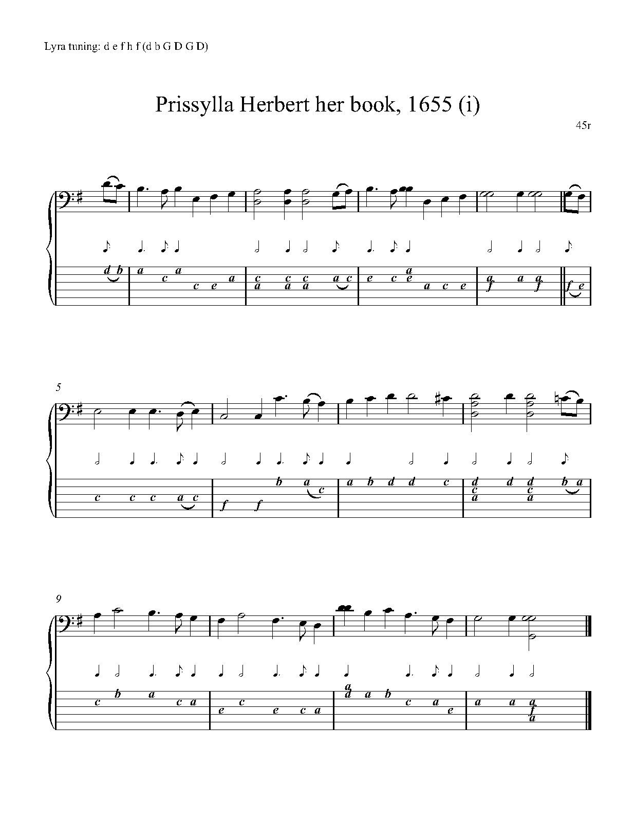 | Extra Information | These two short ayres for lyra viol (in Harpway Sharp tuning d e f h f) are drawn from an unpublished virginal manuscript "Prissylla Herbert her book, 1655" that was part of the Richard MacNutt private collection in Tunbridge Wells, England, in the 1970s. The current whereabouts of the manuscript is unknown. These pieces were copied by hand in the 1970s by Frank Traficante and are transcribed for dissemination here, based on his work. |