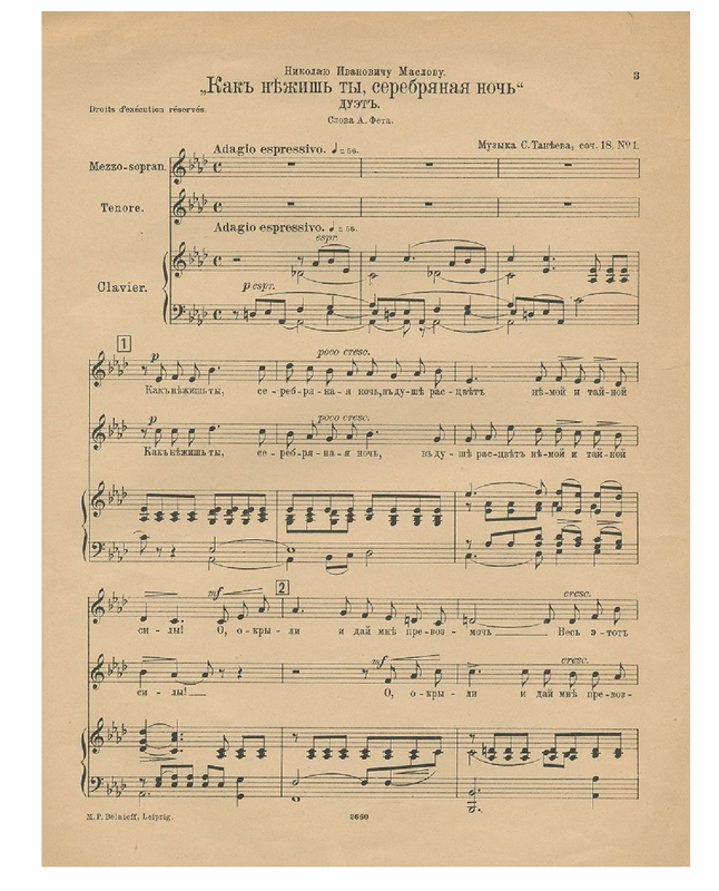 * Nikolay Ivanovich Maslov was the brother of Fyodor Maslov. No.1 is the 2nd version of How Spoiled You Are (1883); No.2 is the 2nd version of Bacchic Song (1884). Also arranged for 2 voices and orchestra.