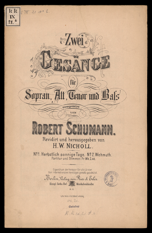 Zwei Gesänge für Sopran, Alt, Tenor und Bass componirt von Robert Schumann. Revidirt und herausgegeben von H.W. Nicholl.