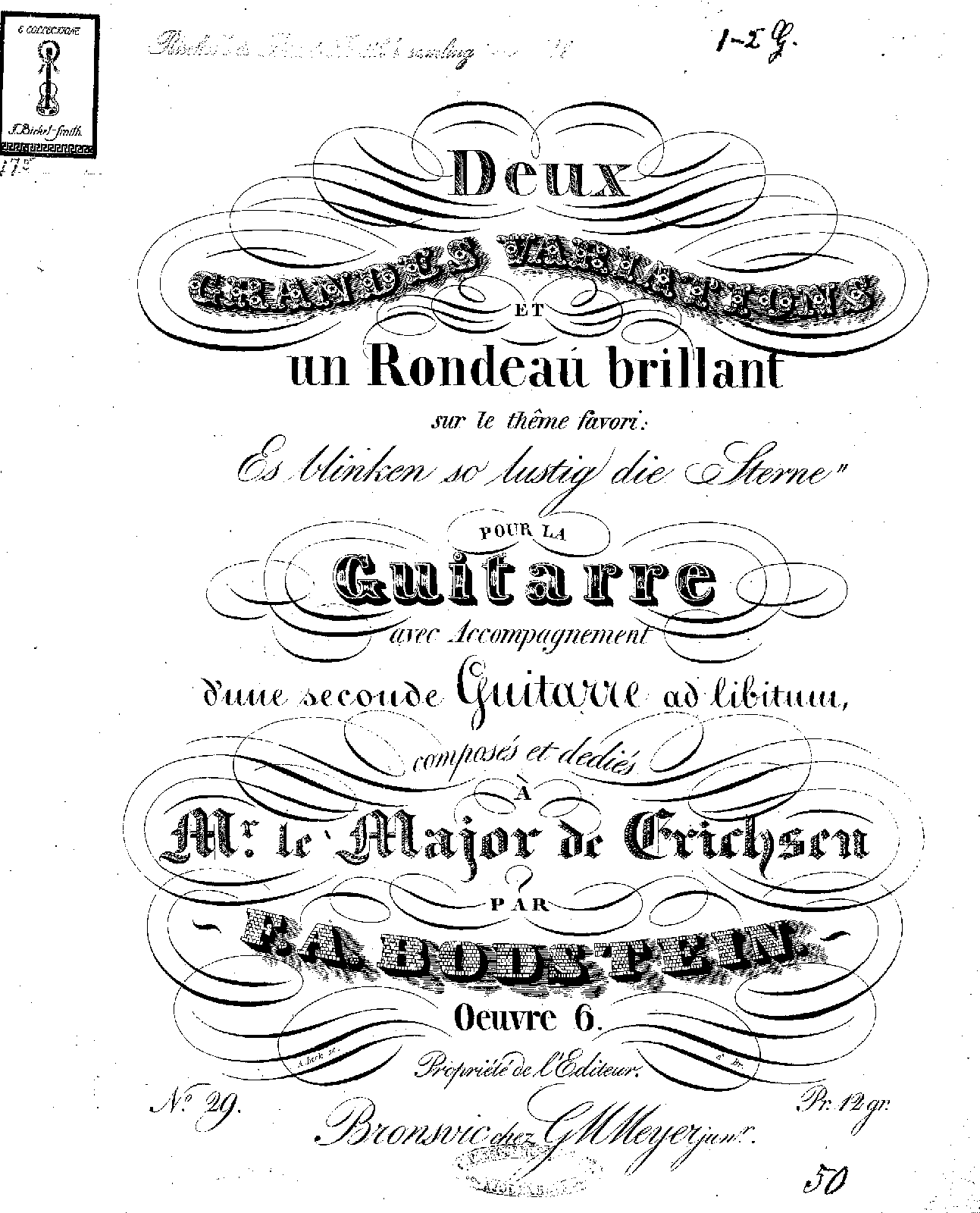 | Alternative. Title | 2 Grandes Variations et un Rondeaú brillant sur le Thême favori "Es blinken so lustig die Sterne" pour la Guitarre avec accompagnement d'une seconde Guitarre ad libitum |