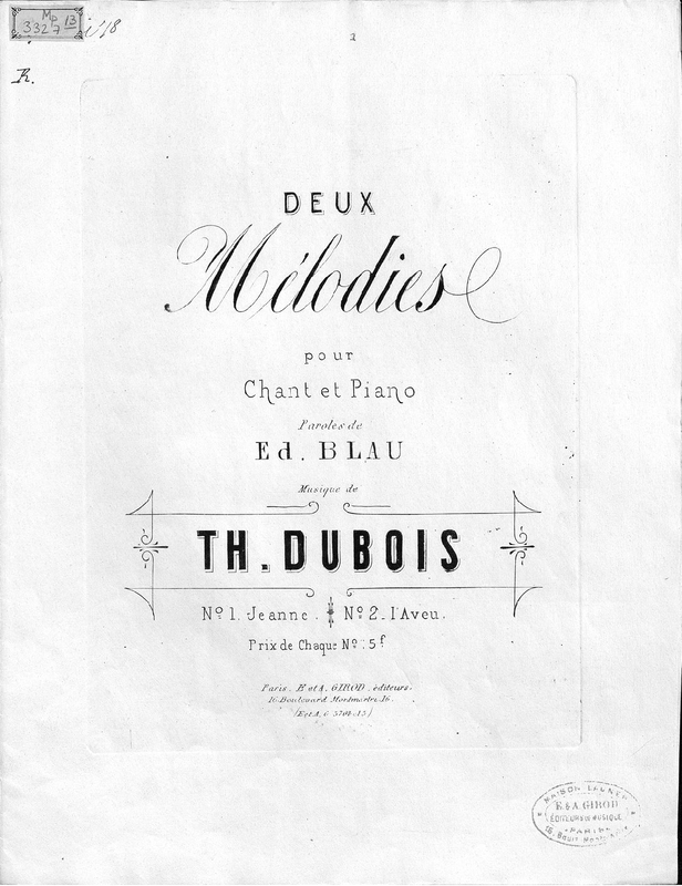| Dedication | 1. à Madame E. Lalo (Julie Lalo, 1843–1911) 2. à Monsieur Bosquin (Jules Bosquin, 1843–1909) de l'Opéra |