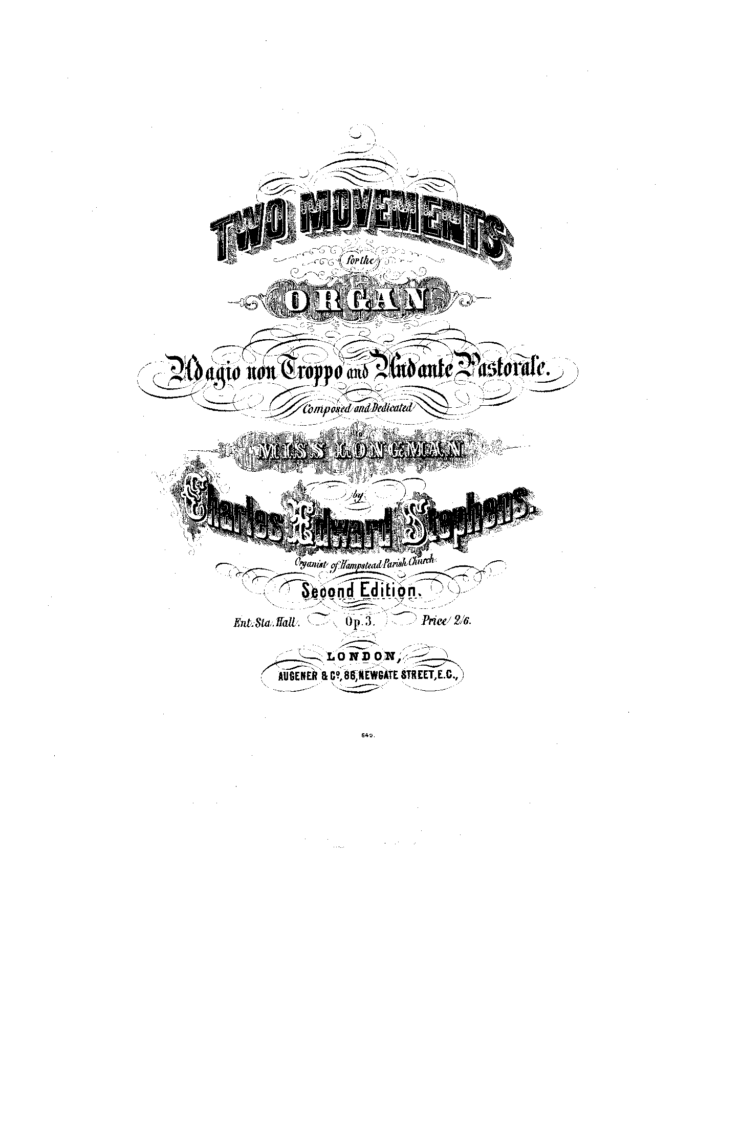 Op.7 is another pair of movements for organ (Andante pastorale & Allegretto piacevole, published 1865.) A third pair of 2 movements for organ, (Elegy & Andantino alla Canone) Op.15 was published by Augener and reviewed in The Musical Standard 7/20/1867. Op.3 was mentioned in The Athenaeum, Aug. 29 1857 p.1094.