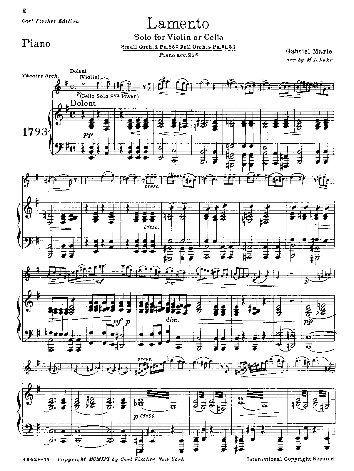 Carl Fischer's Theatre Orchestra Edition, No.1793 New York: Carl Fischer, 1916. Plate 19428-14.