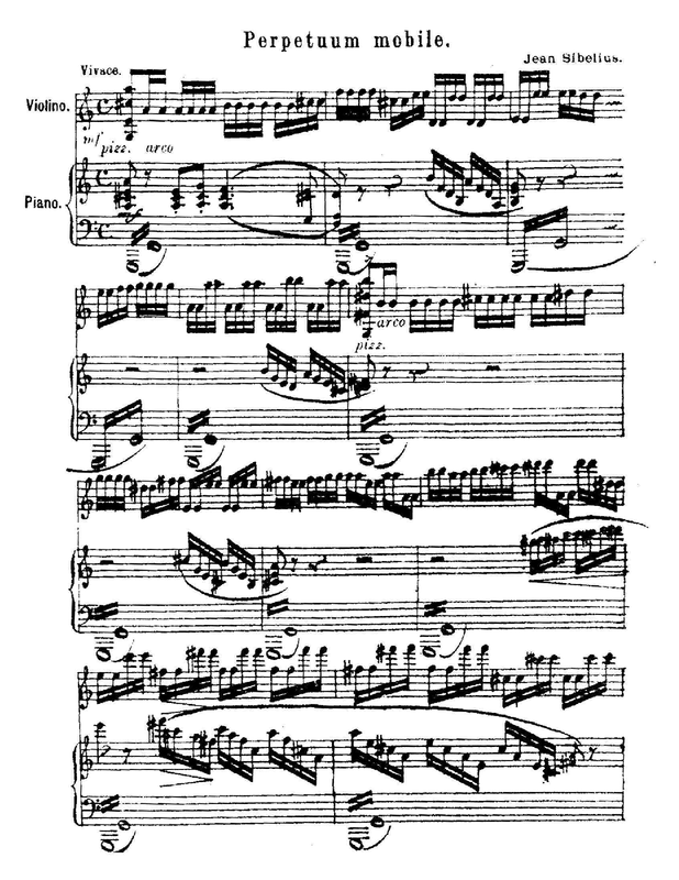 Misc. Notes Sibelius "Perpetuum mobile" original version has been published only once, in a magazine called "Nuori Suomi, Päivälehden joulualbumi," 1891. Copy obtained from Sibelius Institute archives. Violin part is cut and pasted from score.