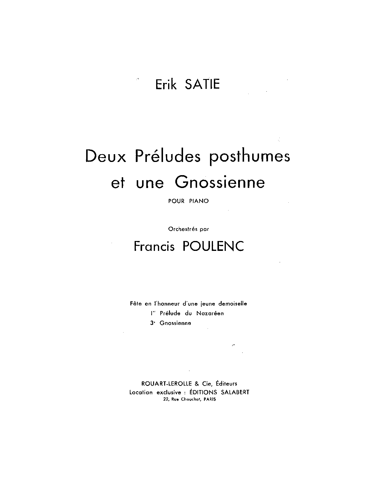 | Work Title | 2 Préludes posthumes et une Gnossienne |